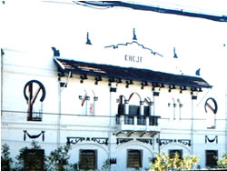 em dois pavimentos, apresenta fachada de inspiração neocolonial.