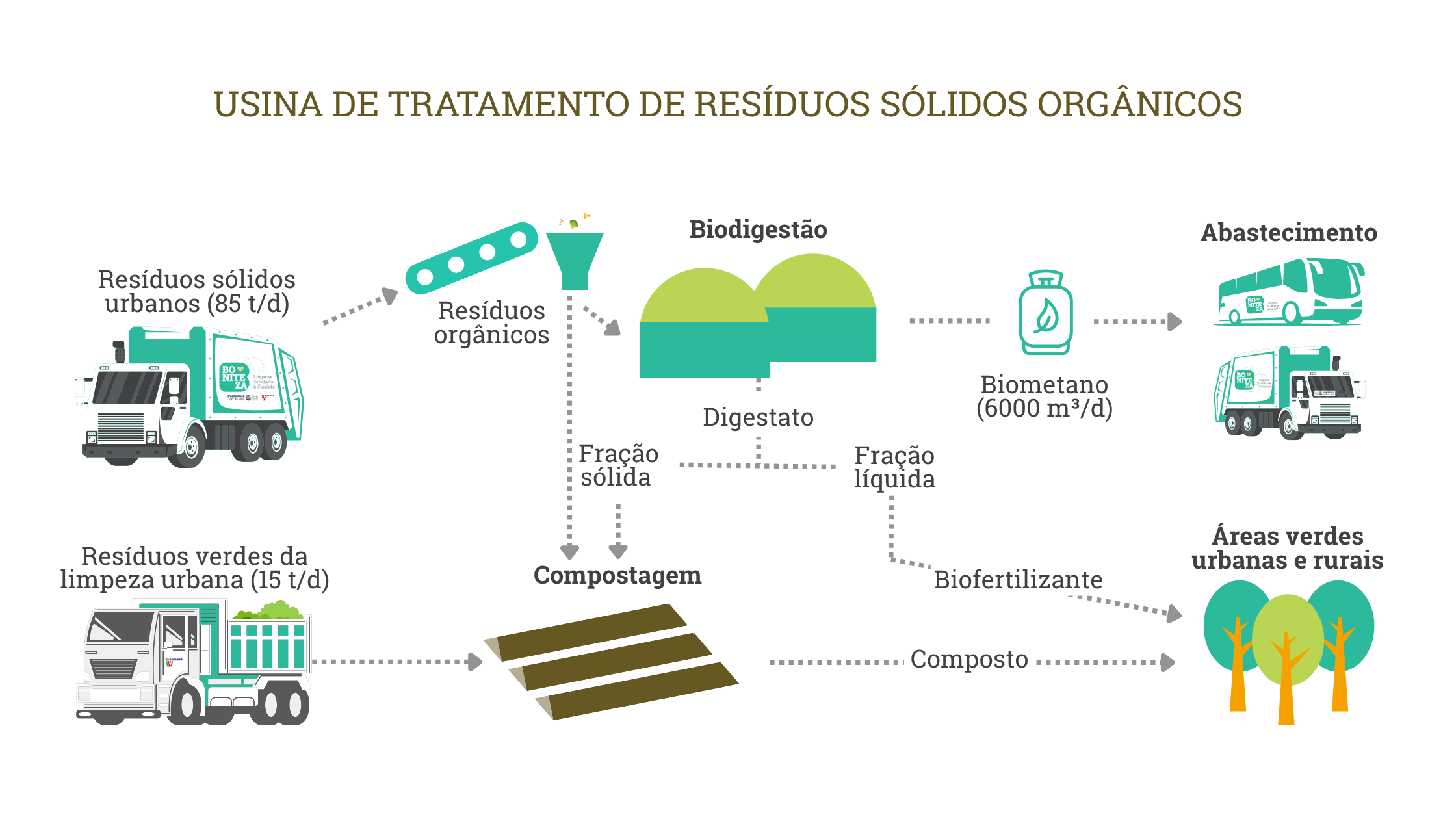 85% Resíduos orgânicos de grandes geradores (shoppings; refeitórios de empresas, instituições públicas e escolas; supermercados; Ceasa etc.); resíduos e efluentes de indústrias de alimentos como na produção de laticínios e da pecuária na bovinocultura, suinocultura, avicultura; lodo das estações de tratamento de esgoto e efluentes de áreas da Prefeitura; orgânicos da coleta seletiva e do programa Lixo Zero.
